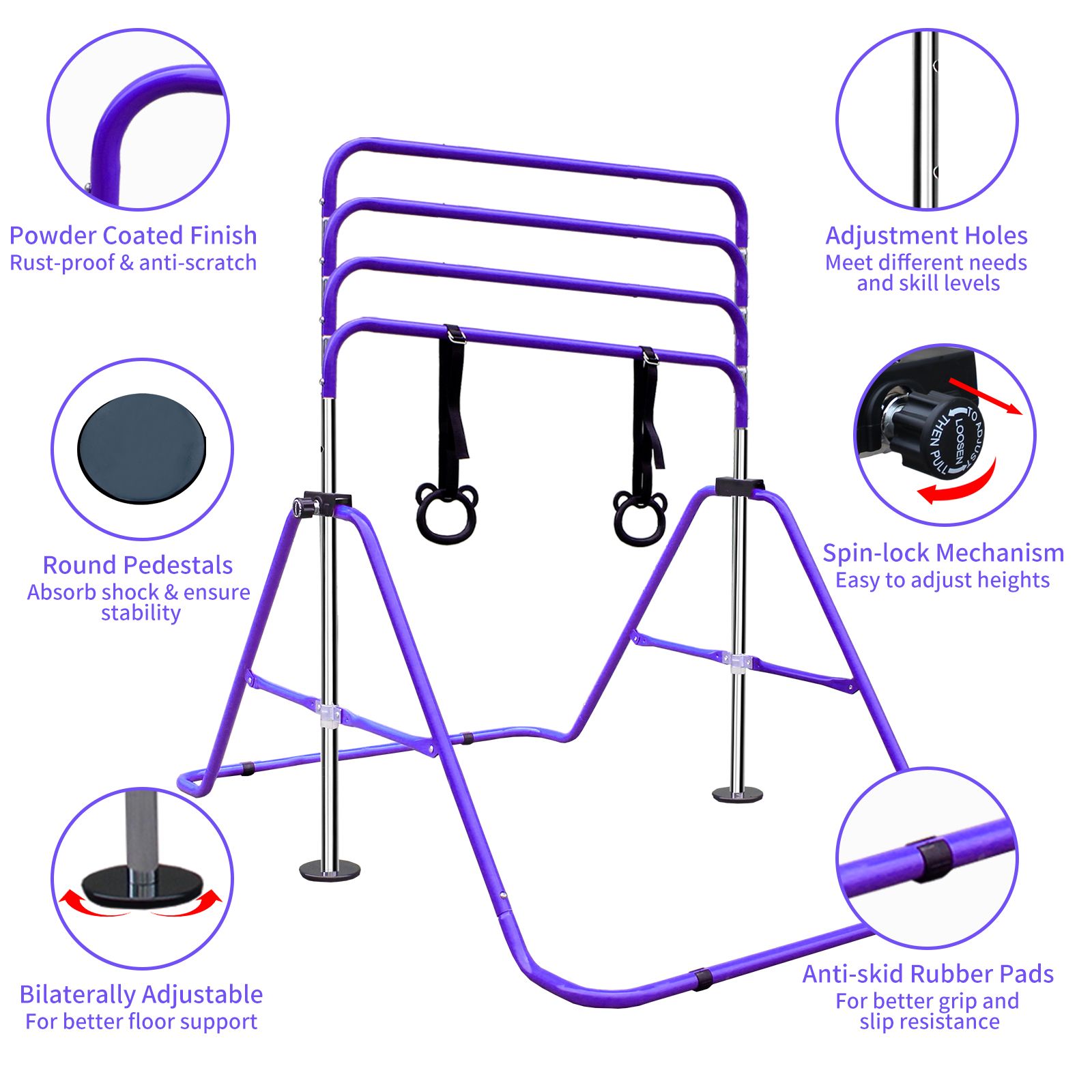 Sturdy Construction:This Gymnastic Bar is foldable steel,tight hinge,anti-rust,high durability.The round pedestals is for better gripand stability.And the lock mechanism is easy to adjust height.The rubber rings is for better grip and slip resistance.The adjustment holes can meet different needs and skill levels.Adjustable heights from 34.8 inches to 51 inches, suitable for 99.99% of children.