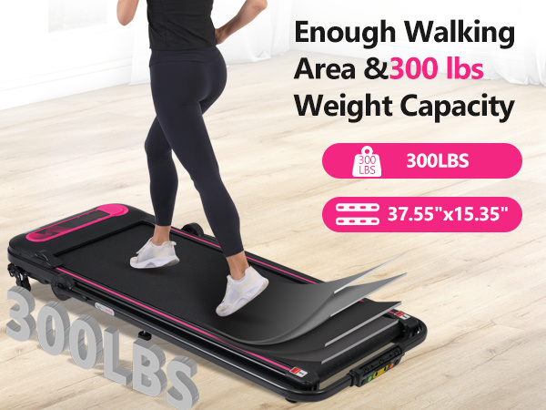 INNOVATIVE 2-IN-1 FOLDING TREADMILL -- Compared to ordinary treadmills, our 2-in-1 treadmill has 2 modes to meet your different sports needs. When the riser is folded, it can be used as a jogging machine at a speed of 0.5MPH-4MPH, when the handrail is raised, the running speed is 4MPH-7.5MPH.POWERFUL 2.5HP -- With a powerful and ultra-quiet 2.5HP motor and load a max weight capacity of 300lbs, this treadmill allows you to walk or run without disturbing others, making it ideal for home and office use. With a sturdy and durable steel frame and multi-layer shield design, it's shock-absorbing and noise-reducing, making your running quieter, safer and more comfortable.WITH PHONE HOLDER, REMOTE CONTROL & Armrest CONTROL -- You can also use the phone holder to watch videos or chat with friends. The remote control (BATTERY INCLUDED) is convenient to adjust the speed of movement and stop instantly. NO INSTALLATION -- No need to install, just take this walking pad out and use it. The dimension of the electric treadmill is 45.66"*19.29"*3.93". With transport wheels, you can easily move and store it under a sofa, bed, or behind a door, which greatly frees up some floor space.FITNESS TRACKING DISPLAY -- Our portable Treadmill is designed with a LED display to show speed, distance, time, and calories burned, allowing you to visualize your exercise and maintain motivation. You can control the speed or stop the treadmill by pressing the remote control.PROTECT YOUR KNEES -- 5 layer anti-slip belt of this desk treadmill is designed to absorb the force of your step, to protect your joints and ligaments from damage.NEW DESIGN WITH INCLINE--New Treadmill With One Second Incline Adjustment. Burn fat more effectively