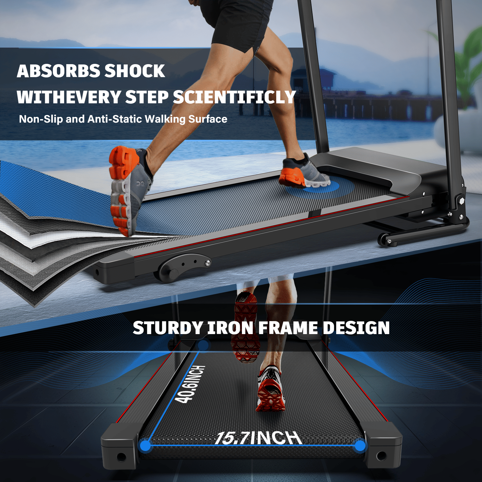 3.The 2.5 HP motor offers speeds from 0.5-7.5 MPH, ensuring that the motor runs quieter without disturbing others.Five-layer non-slip running belt is more durable and quiet. The compact treadmill's one-piece compression technology makes for a smooth running belt splice.