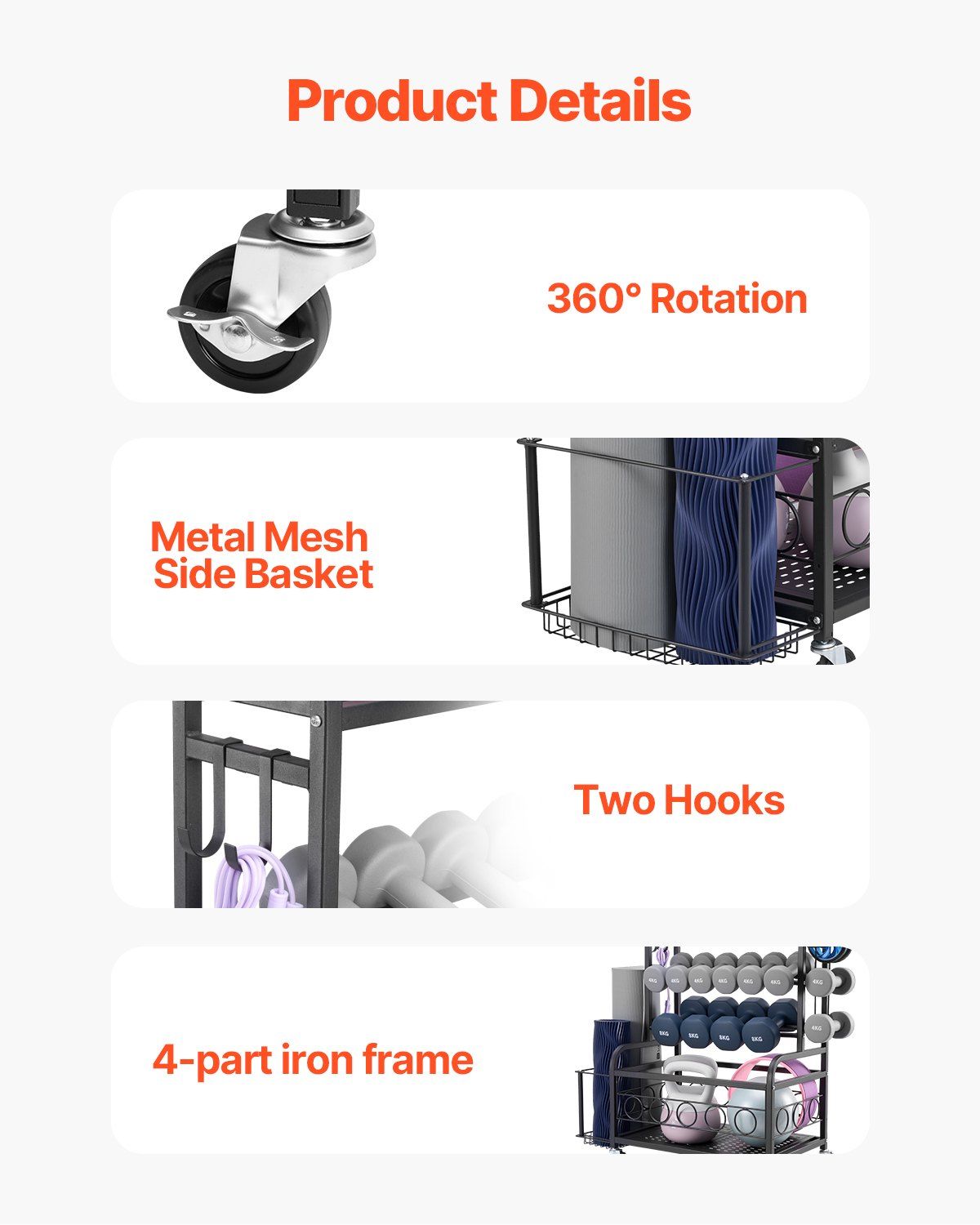With various storage spaces and methods, this yoga mat holder maximizes the storage capacity of your workout equipment, making it easier to access items at the bottom. Equipped with four sturdy 360-degree wheels (two lockable), it meets your needs for mobility and stability.